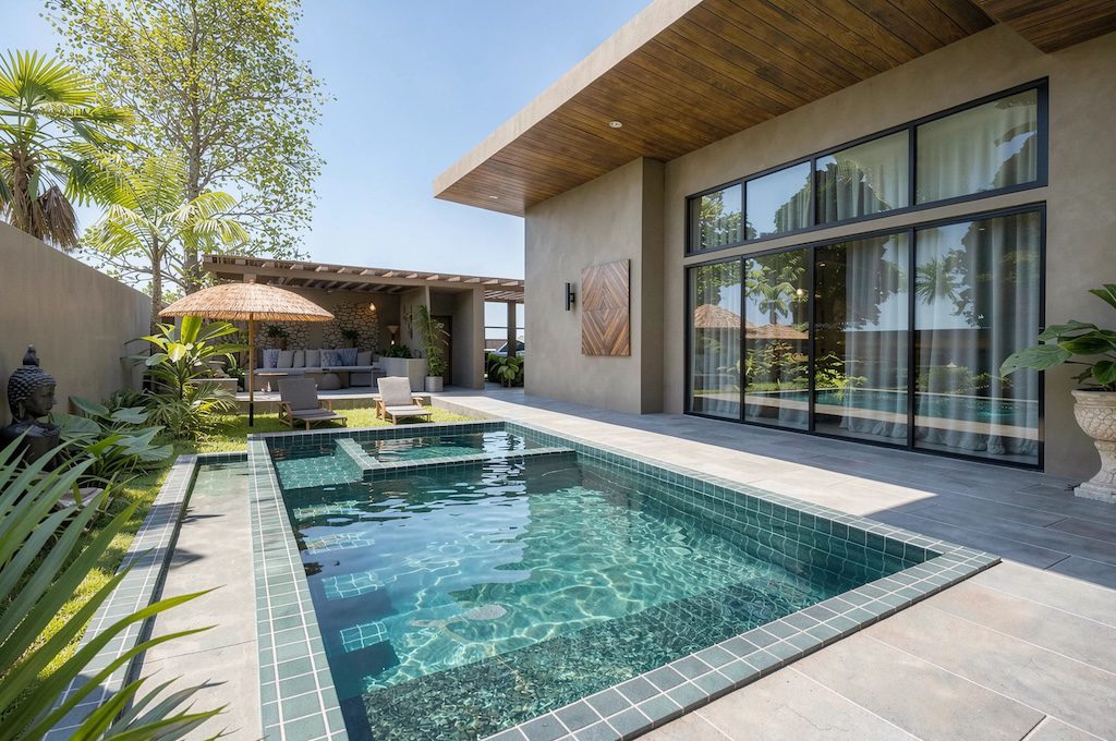 Each 2-bedroom villa at Verdant Residence Maenam showcases contemporary architecture infused with authentic Balinese design elements, creating spaces that feel both modern and deeply connected to the island’s natural beauty. The single-level layout maximizes the seamless flow between indoor and outdoor living, featuring expansive glass panels that flood the interiors with natural light while maintaining energy efficiency. Every villa comes completely furnished with high-quality fixtures and fully equipped kitchens, ensuring immediate move-in readiness for owners and guests alike.
